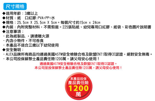 內附完整材料,不需剪裁。225張貼紙、幼兒專用口紅膠、紙袋、彩色圖片說明書。