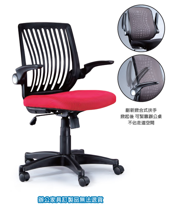 ◎特色:創新掀合式扶手,掀起後可緊靠辦公桌,不佔走道空間