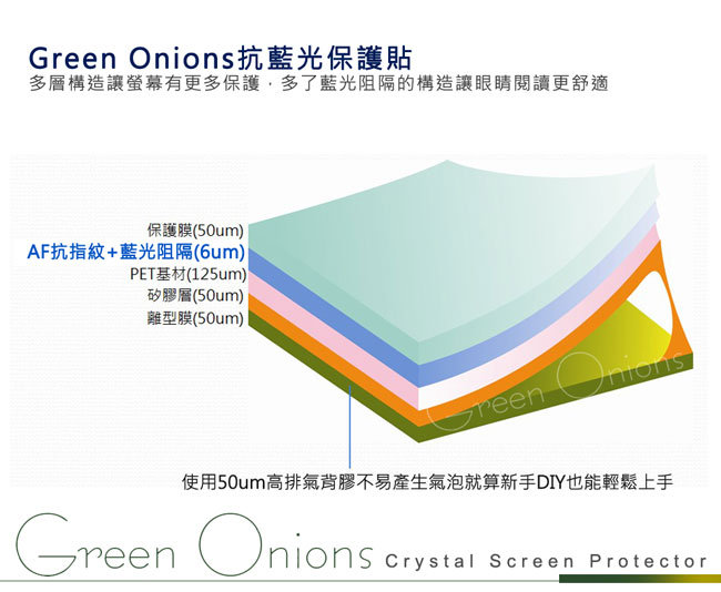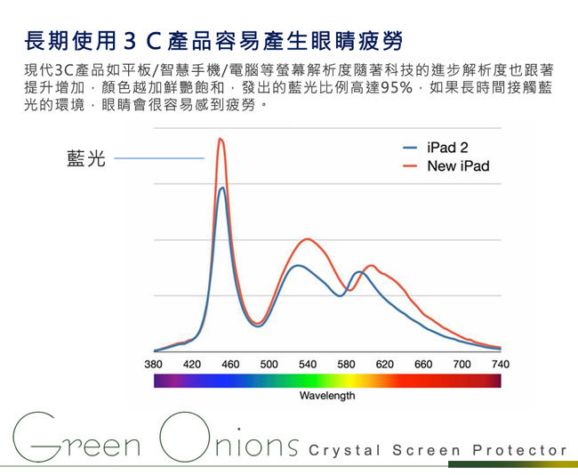 隨著現代人3C產品不離手的習慣,用眼注視螢幕的時間增加,因此Green Onions推出有效阻隔43%有害藍光的保護貼,觀看螢幕更舒適。