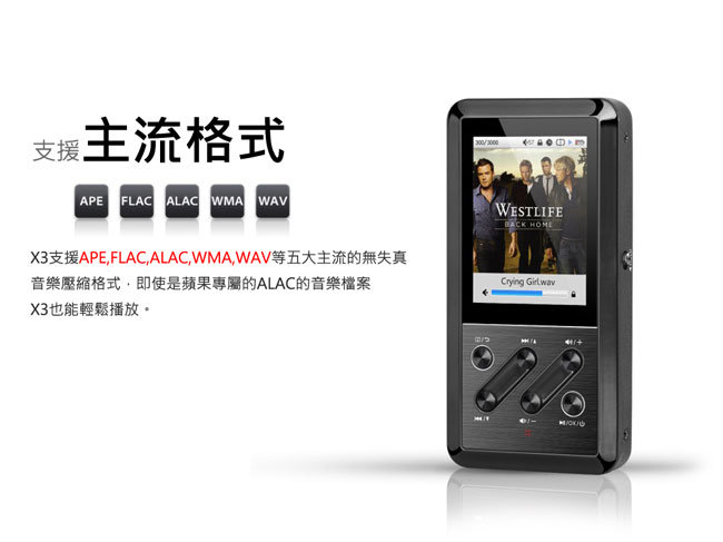 X3可支援APE/FLAC/ALAC/WMA/WAV等五大主流的低失真音樂壓縮模式,是目前專業隨身播放器中支援格式最齊全的機種,就不用再為不能播放某種特定格式而傷腦筋。