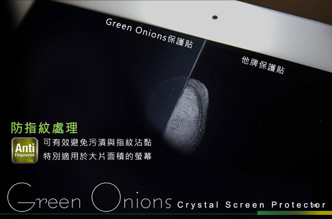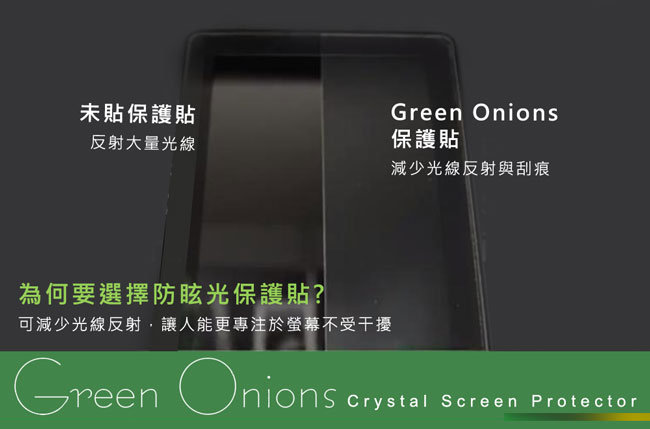 Green Onions的保護貼防指紋/防眩光霧面處理,使用時,不易被光線反射的影像干擾,能夠輕鬆閱讀螢幕。