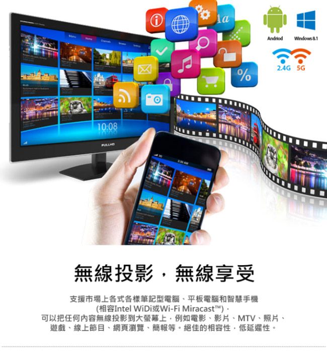 2.Anroid4.2以上並支援Wi-Fi Miracast無線顯示技術的手機/平板