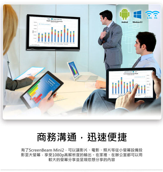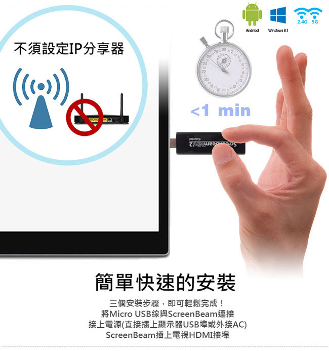1.產品僅為ScreenBeam Mini2及其內容包裝物,圖中手機平板等僅為示意使用並無包含在產品中。