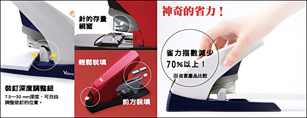◎ 特性:超省力專利雙槓桿結構、針腳平貼、十段裝釘位置調
