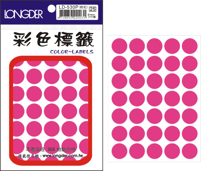 商品名稱:龍德 彩色圓點標籤 LD-530P-螢光粉紅色 (直徑16mm) /包
