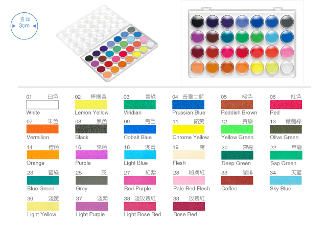 體積輕巧,攜帶方便,以鮮豔而細膩的粉質顏料壓製而成,