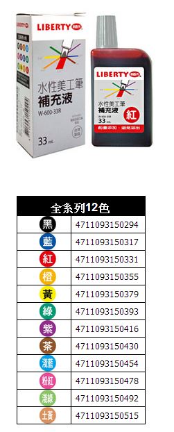 商品名稱:利百代 W-600-33R 水性美工筆補充液12色 / 瓶