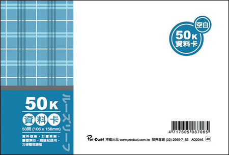 商品名稱:博崴 AO2046 50K布格紋資料卡-空白 / 本商品單位:本商品型號:AO2046商品規格介紹:◎尺寸:156W x 106H◎入數:100張(本)廠商代號:ARA責任代號:HYC