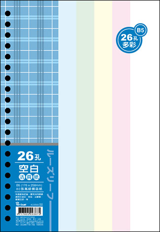 商品名稱:博崴 AO3593 B5 26孔布格紋活頁紙-空白/多彩 -5包入 / 袋商品單位:5包入 / 袋商品型號:AO3593商品規格介紹:◎尺寸:176W x 257H◎入數:80張(包)◎適用於:B5/26孔夾廠商代號:ARA責任代號:HYC