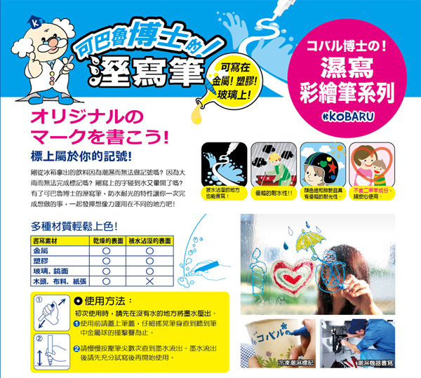 ◎溼寫筆特色:優越的耐水性,被水沾溼的地方也能書寫!