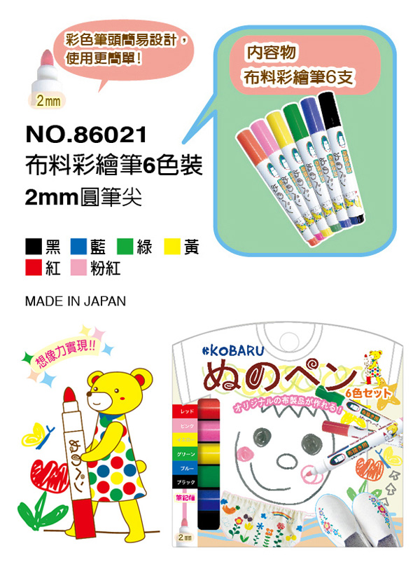 ◎品名:Kobaru可巴魯 NO.86021 布料彩繪筆6色裝