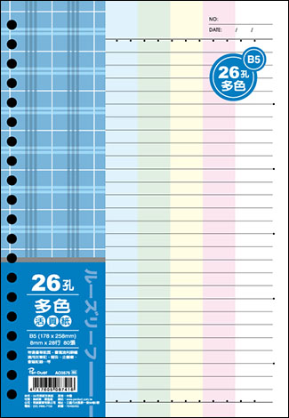 商品名稱:博崴 AO3575 B5 26孔布格紋活頁紙-多色 -5包入 / 袋商品單位:5包入 / 袋商品型號:AO3575商品規格介紹:◎尺寸:176W x 257H◎入數:80張(包)◎適用於:B5/26孔夾◎橫線:8 mm ruled line廠商代號:ARA責任代號:HYC