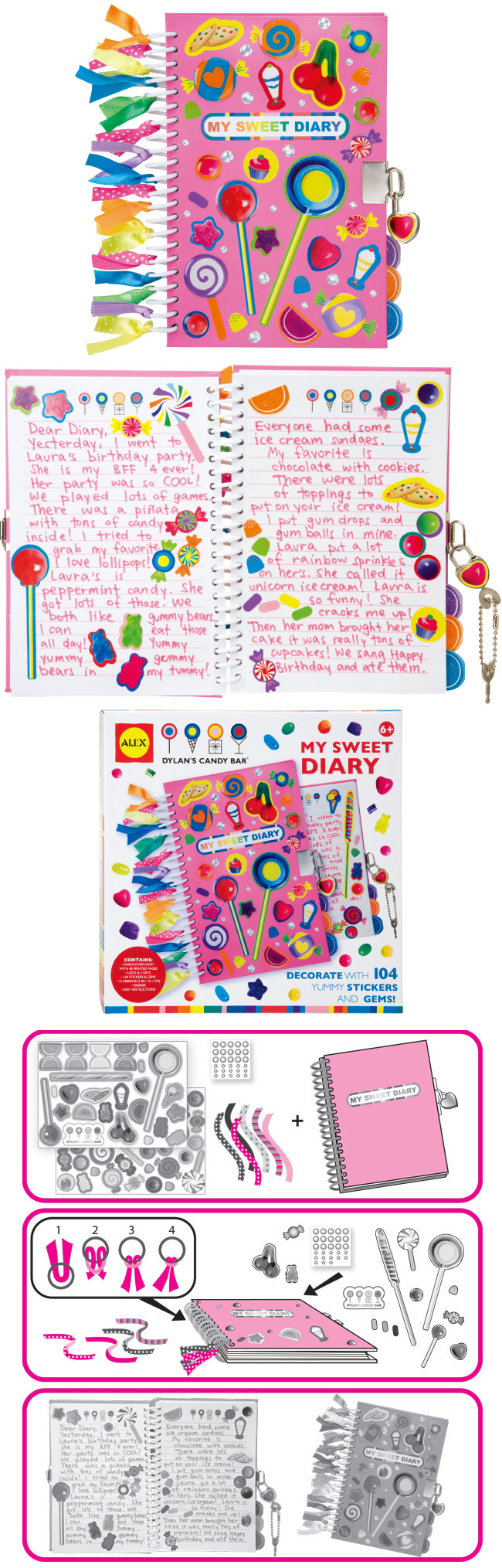 堅硬精美的書殼,附鎖和2把鑰匙、104個裝飾貼紙、寶石及15條漂亮的緞帶。